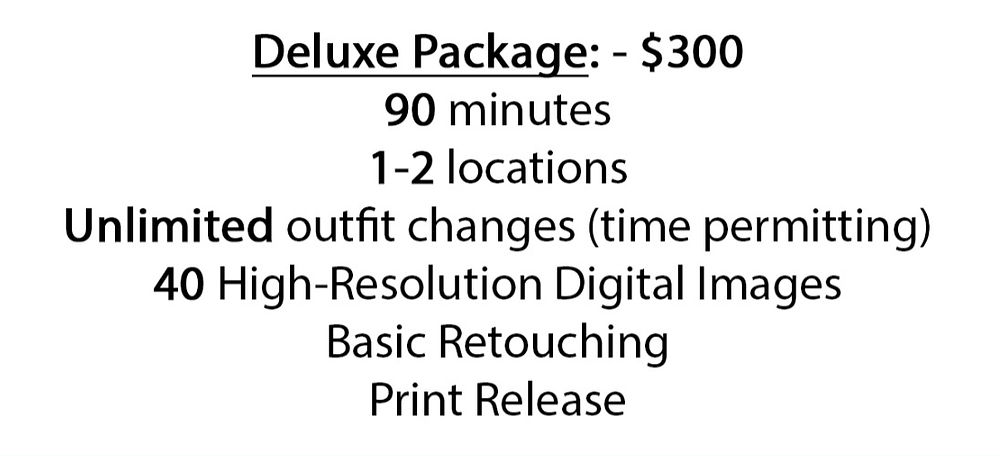 200 US dollars1-2 Locations Unlimited Outfits 60 High-Resolution Digital Images